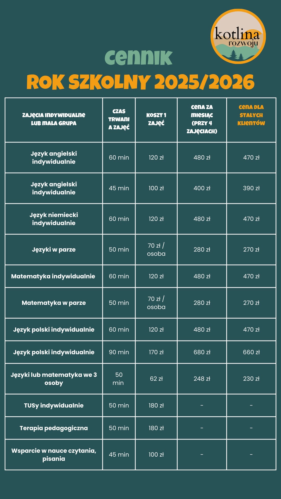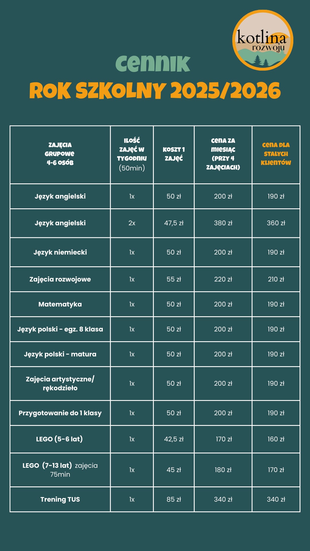 60 zł / 90 min – zajęcia w grupie od 5 osób (przygotowanie do matury)